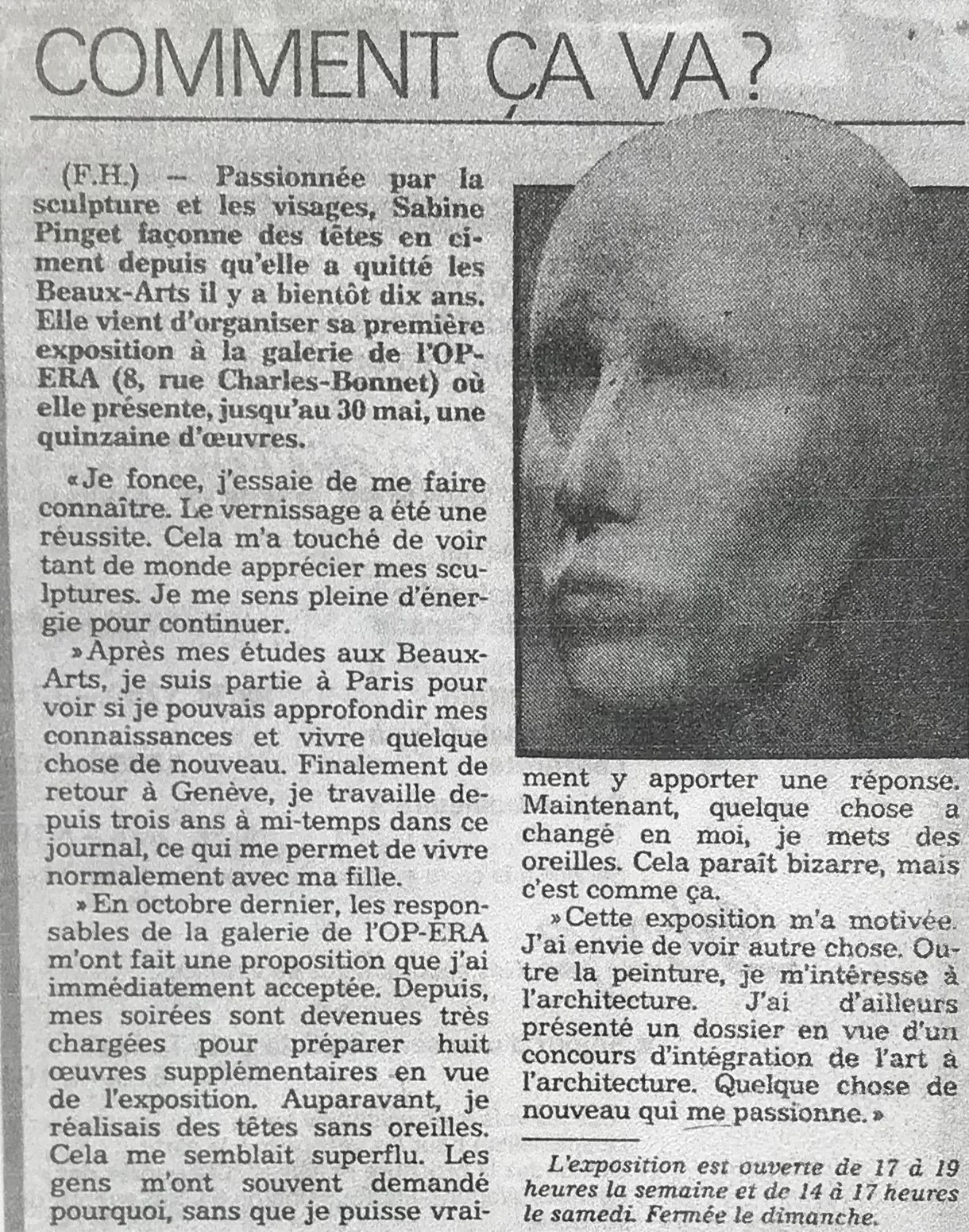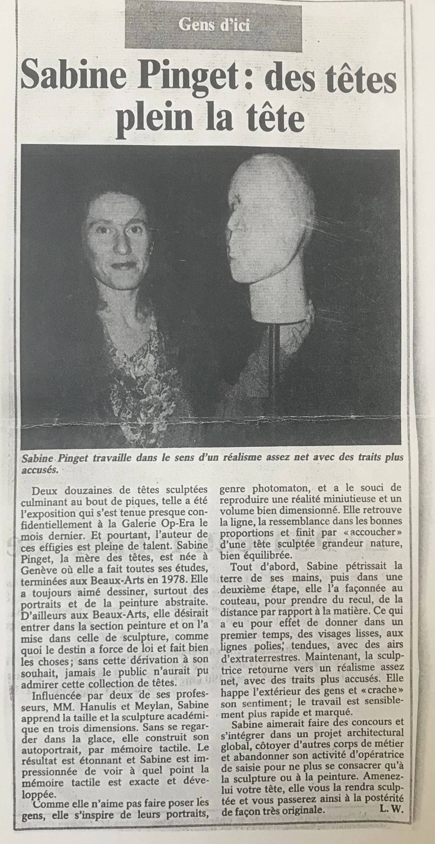 En 1979, elle expose une série de têtes en ciment à l’Anthénée, puis à la Galerie de l’Op-Era. Le Centre médical universitaire de Genève acquiert cette série et l’expose durant une quinzaine d’années.